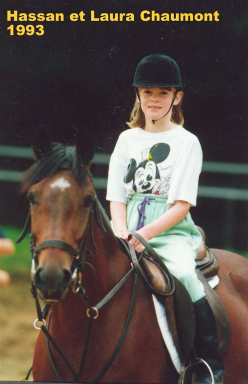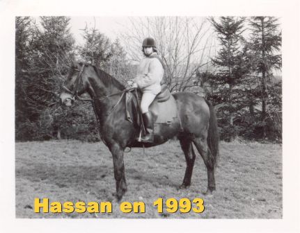 Hassan est né en 1986 chez un agriculteur, tout près des Trois Bornes. Sa mère était une lipizzan, race rare dans la région. Vers 1980, un cirque aux maigres finances en tournée parmi nos villages l'avait cédée à l'éleveur. Son père était un étalon BWP. Hassan nous a rejoints en juin 1991.