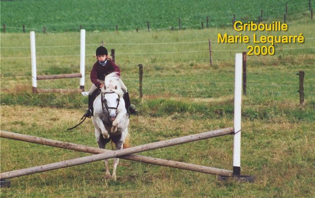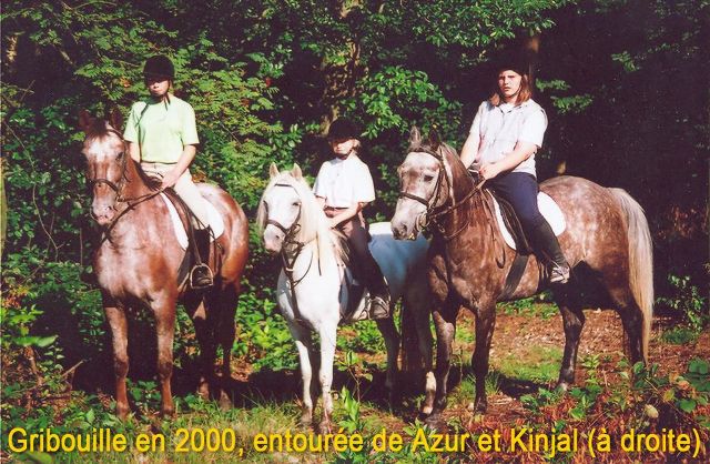 Gribouille est entrée dans l'écurie en août 1994. Achetée à un marchand en même temps qu'une autre ponette grise : Yeoudi. Cette Yeoudi a vécu trois ans chez nous. Elle avait une bouche merveilleuse, mais demandait une main moelleuse et précise. Pas vraiment la description d'une main de débutant ! Trop peu de petits cavaliers la montaient correctement. Yeoudi se défendait. Elle n'était pas faite pour l'école. Dommage, car c'était un excellent poney.