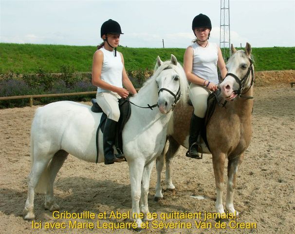 Gribouille était très liée à un autre poney, le hongre Abel. C'était le couple du manège. Installés dans le même box ou côte à côte en stalles, même en prairie, ils ne se quittaient jamais. On voit souvent, quand on observe la vie sociale des équidés, de telles amitiés profondes. Ce sont dans la majorité des cas un hongre et une jument qui passent ainsi leur destinée ensemble. Ces relations sociales entre eux sont une composante essentielle de l'existence des chevaux. Gribouille n'a pas laissé que de bons souvenirs. Certains cavaliers, prévenus qu'il fallait la monter, tentaient par tous les moyens d'y échapper : regards implorants, supplications, simulation de maux de ventre, mines dépitées. Gribouille jouissait en effet d'une terrible réputation. La technique qu'elle utilisait pour vider sa selle n'appartenait qu'à elle et c'est avec un certain brio qu'elle en usait couramment pour manifester son mécontentement de devoir galoper derrière la reprise. Cela permettait aux plus téméraires ou aux plus adroits de démontrer leur courage en affirmant aimer monter ce poney. Mais Gribouille c'était aussi une jolie ponette. L'image de sa crinière flottant au vent du galop (allant jusqu'à recouvrir la cuisse des cavaliers) est un souvenir charmant. Pendant treize ans, elle a assuré régulièrement son service au manège sans ennui de santé ni autre souci important. Elle a été la monture de très nombreux élèves lors des cycles d'obstacle. Elle a permis la réussite d'une flopée d'examens. A l'automne de cette année, Gribouille a été vendue à une petite cavalière, Jessica Lawerens, qui l'aimait beaucoup. Elle est maintenant en pension au cercle équestre de la Belle Fleur à Cheratte.