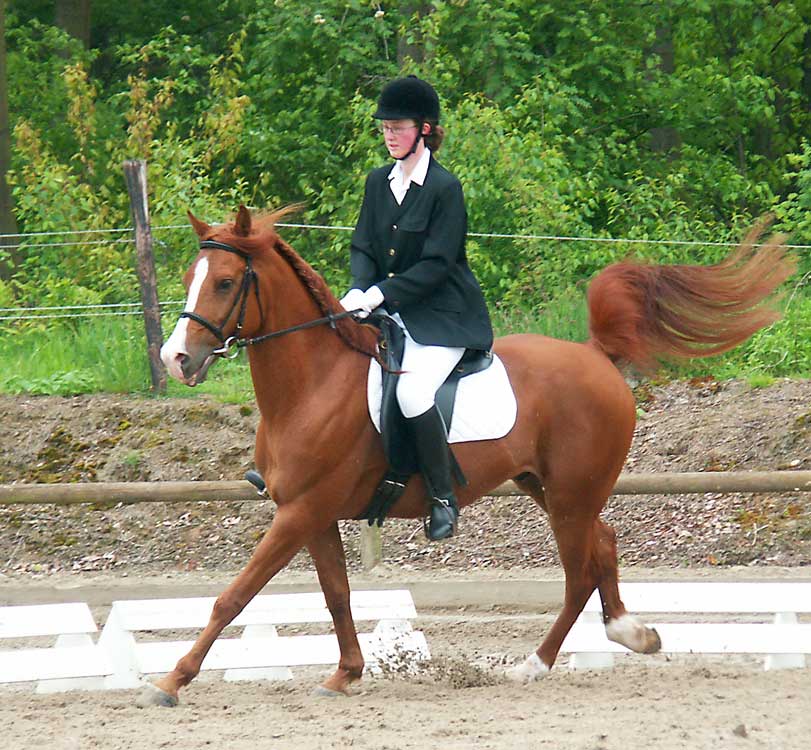 Le 23 avril, à Recht, Kwinjy a gagné une course nationale de 75 km . Ce n'était pas vraiment voulu. Dans cette discipline la plupart des courses se courent comme préparation en vue d'objectifs plus importants. Petit à petit, de course en course on amène le cheval au mieux de son potentiel. A Recht, le but était de faire les 75 km à 15km/heure. Pour ne pas me retrouver seul dans la deuxième partie, j'ai suivi 2 cavaliers qui allaient un peu plus vite. Ils ont levé le pied à la fin, Kwinjy a poursuivi sur le même rythme et a terminé premier à 16 km/heure. Ensuite, nous l'avons ressellé pour 25 km supplémentaires afin de le tester sur 100 km . Je voulais savoir s'il était en forme en vue du championnat de Belgique, 160 km , fin mai à Marchin. En définitive, il participera bien à une course de Marchin, mais sur la distance inférieure de 127 km car il n'est pas encore prêt pour le championnat.Endurance : Kwinjy gagne une course, avril 2006 ) |