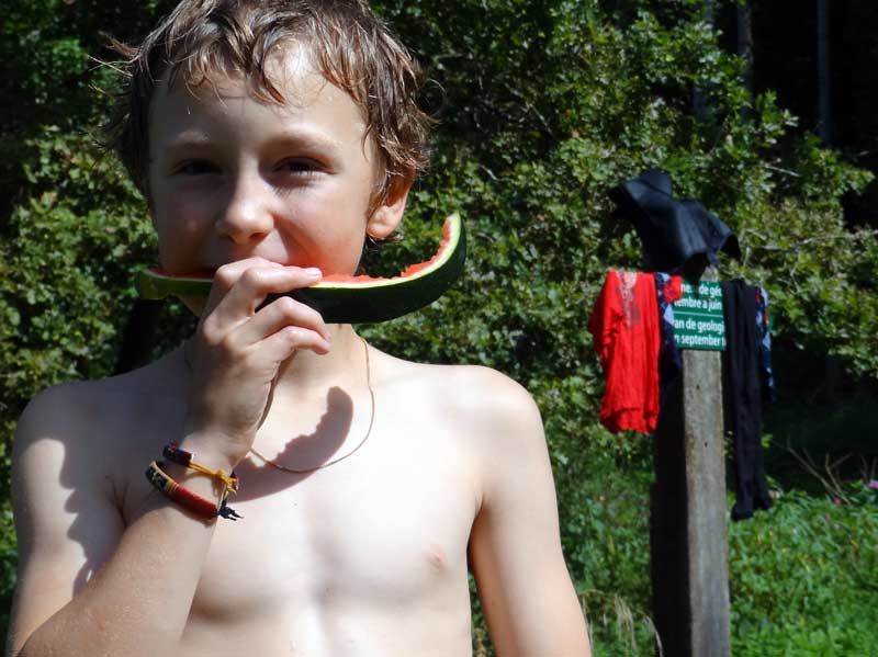 Ses vêtements sèchent sur un panneau indicateur et Léo se rafraîchit encore un peu plus avec un morceau de pastèque.